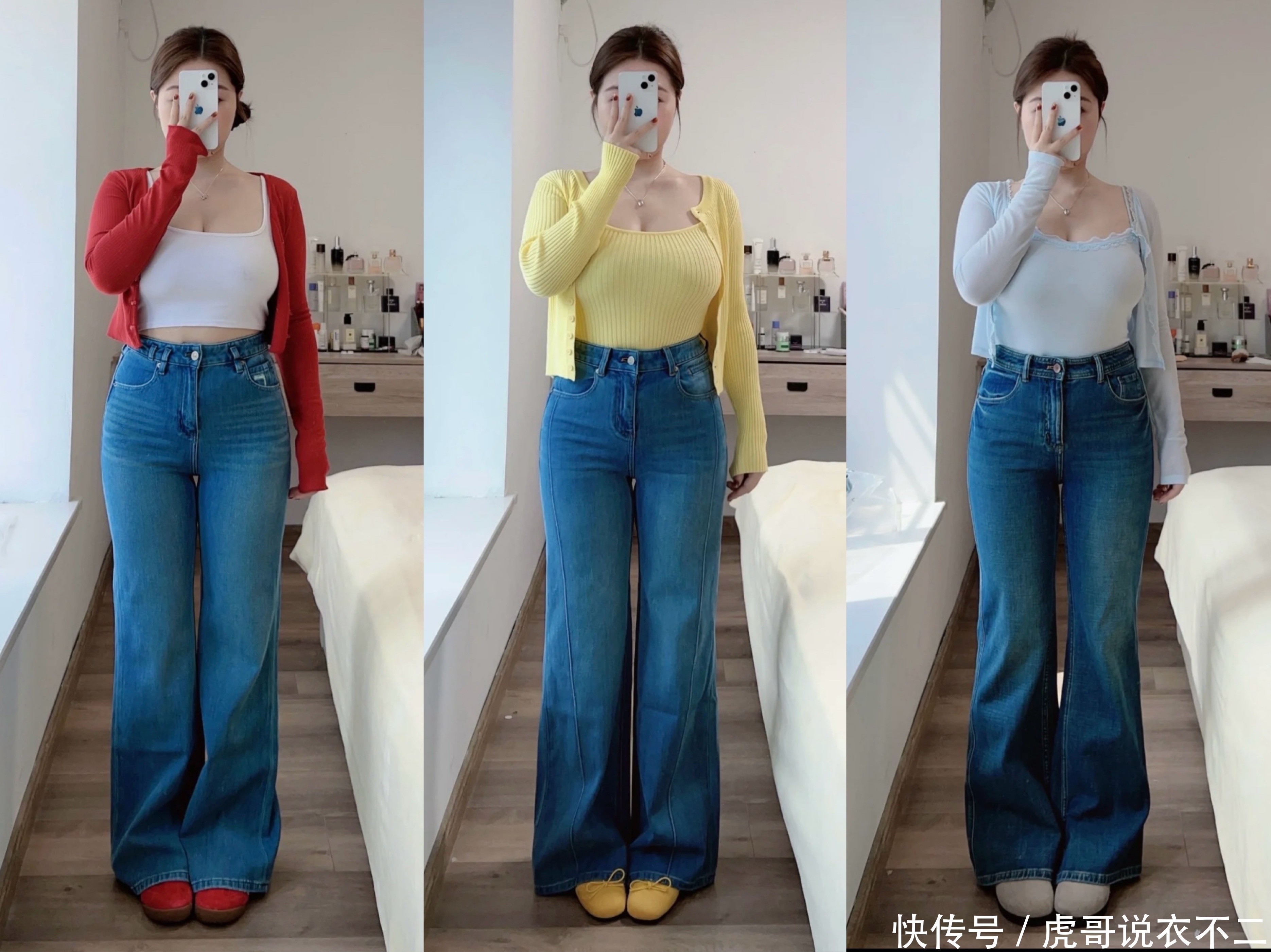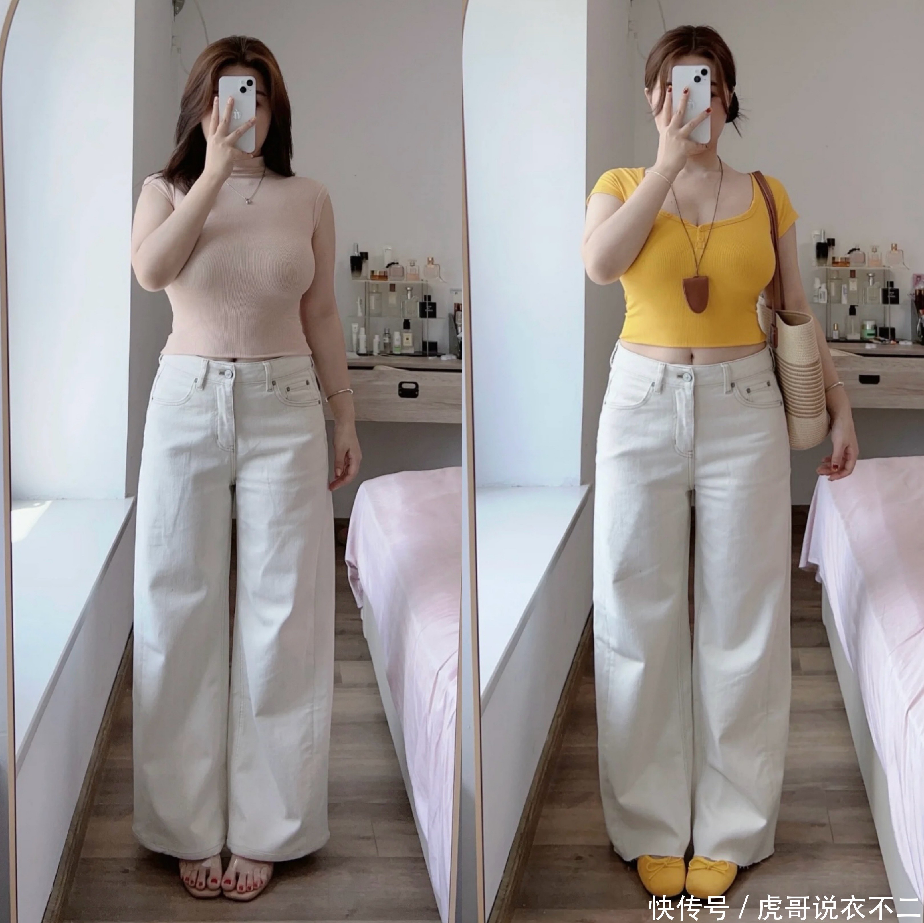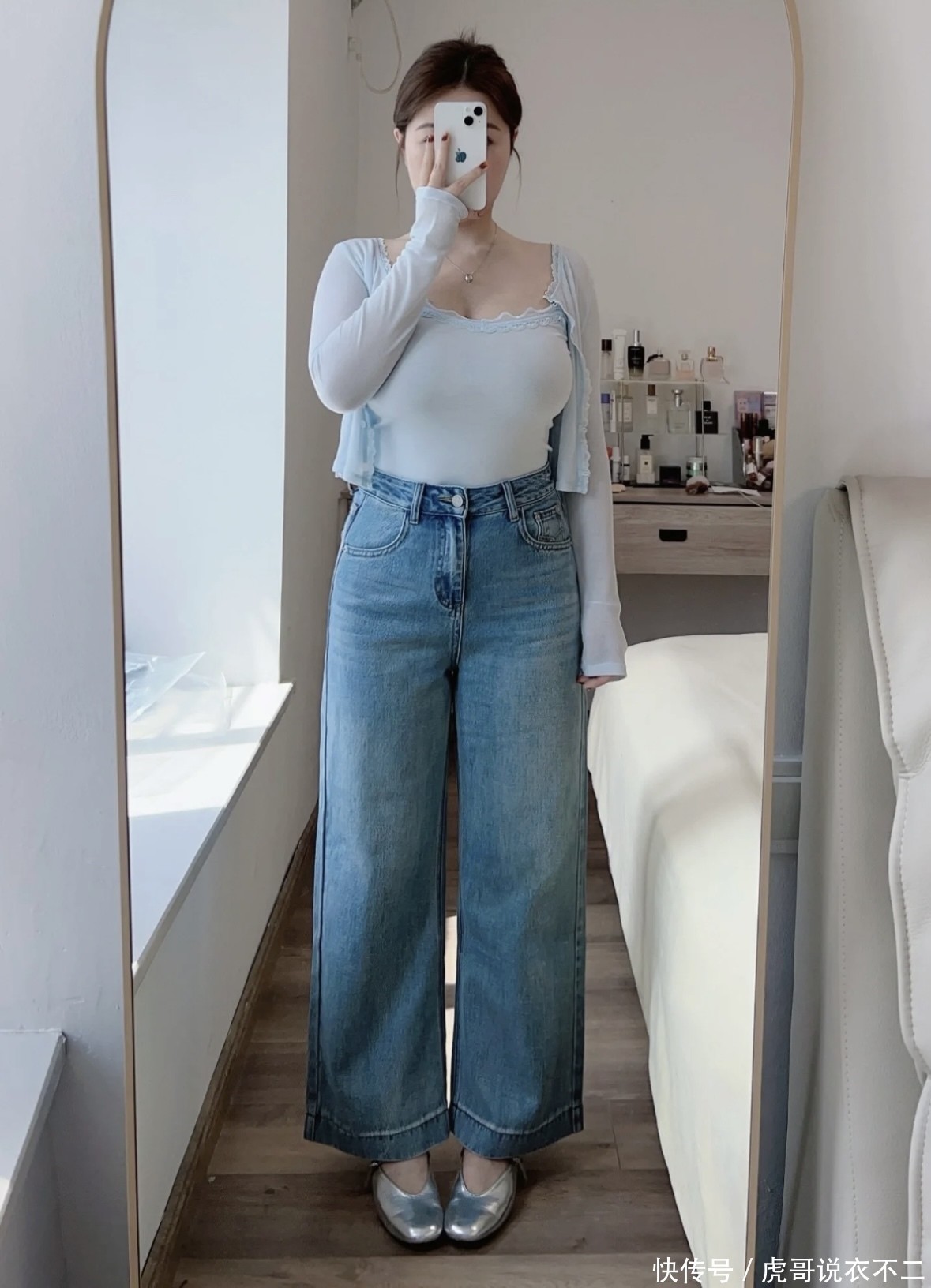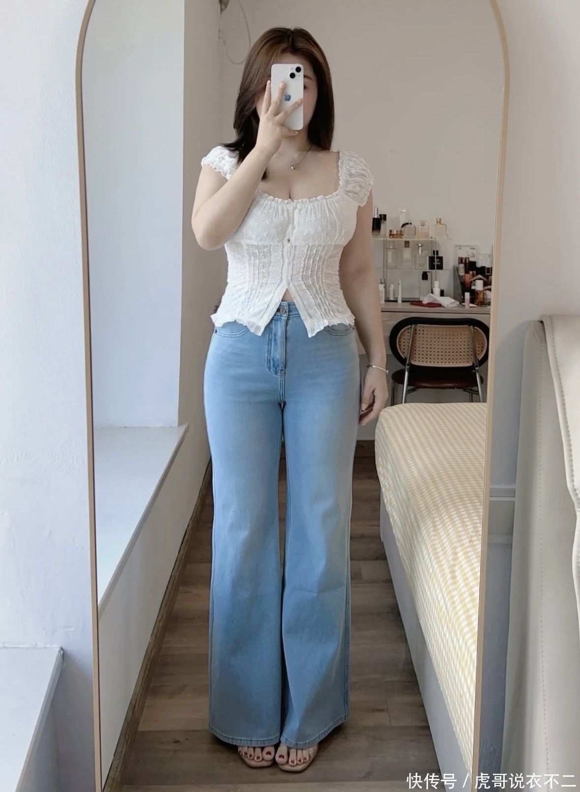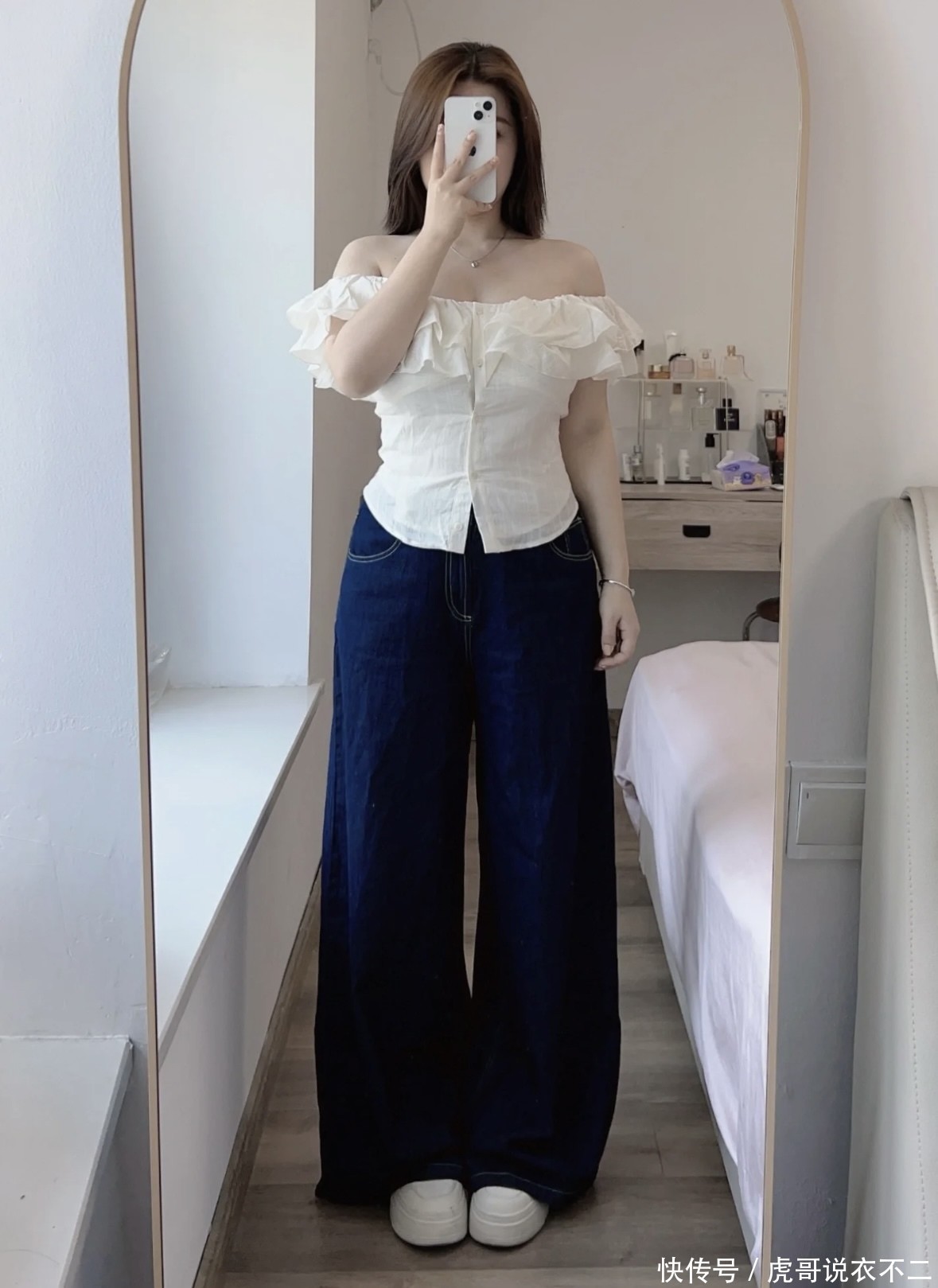 同一字肩效果一样,通过露肤来达到显瘦效果,微胖的女生也可以尝试修身版,但要做到松弛有度,必须收腰款的大方领上衣搭配高腰牛仔阔腿裤,上紧下松,更能凸显身材曲线。